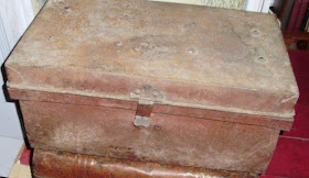 Bottom two were used on the back of an old car in the 1920's-1930's (as seen in second photo) to hold whatever couldn't fit inside, luggage, tools etc. Largest trunk on bottom measures 26 by 16 and is 19 inches tall. Middle trunk measures 27 by 13 and stands 16 inches tall. Top is a small tool box, making a stack of three! Middle box is SOLD! Bottom box is SOLD!